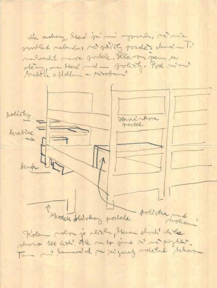 23. X. pondělí První den práce. Jenže jsme zabloudili a na místo práce vzdálené dvacet minut jsme nastupovali po cestě dvě a půl hodiny dlouhé. Uhlazovali jsme písek — a rozhazovali — na letišti. Byl to skvělý pohyb na zdravém vzduchu a později jsem se přihlásil do 20 silných mužů na přehazování kolejnic. To byla práce ještě příjemnější a rušnější! — Je mi stále tepleji a tepleji. — Změřil jsem, že každý z nás máme do šířky 63 cm místa. 24. X. úterý Pracujeme na témže místě. Viděli jsme už třetí překrásné hejno hus na tahu. Jsme všichni náramně spokojeni a jsem tu mnohem raději, než bych byl v Praze, kdybych tam musel chodit do továrny. Vojáci s námi zacházejí s velikými ohledy. Ovšem o naše ubytovací poměry je postaráno co nejhůř. Nemáme postelí, umývárny, nemáme ani místo ani světlo. Večer bez světla je velice obtížný. Musím zase večer na procházku s Havránkem, abych vydržel spát až do rána a nebyl buzen dupáním čuralů a práskáním dveří! (3. dopis) Kolem tábora hoří ohýnky kuchařů amatérů. 25. X. středa Pod mrakem, zase chladněji. Jsme opět v „ rup-koloně“, nyní „ohřívárně“. Dnes letěla hejna hus pokaždé skoro přes nás. — Lidé v baráku se už méně hádají. Mnozí už si udělali palandy. Zvlášť střední barák se už dobře zařídil. Mám strach, zda jsem se nenachladil. (4. dopis) Před spaním byl lidový soud. Několik mladíků se toulalo kolem tábora v lesích, byli chyceni vojáky a přivedeni pod bodákem do tábora. Dva byli vůbec přes celé dva dny v Oppelu. Vedoucí baráku jim vyčinil, u ostatních povstalo rozhořčení proti provinilcům ze strachu, že by mohly přijít represálie. Když mladíci odcházeli, dostali bití, facek, pohlavků a kopanců. Ovšemže každý byl pro jiné řešení stejného stanoviska, a tak hádky, které už pohasly, zase se rozbujely. — Smutný mladík Kraus, který o sobě říká, že je nemocný nervově, duševně a že má dýchací cesty a zuby v nepořádku, se snad proti své vůli vzpružuje. Přišel velice špatně vypraven. Na jídlo má nádobku od lepidla a umyvadlo, místo potravin si s sebou vzal knihy, které mu potom kamarádi pomáhali vyházet z vlaku, a na sobě má jen tenké černé kalhoty. Ale i u Turkovy kolony je jeden melancholik, nějaký JUDr., který chodí a uhlazuje písek stále jen nám. 26. X. čtvrtek Dnes jsem se já zamotal do rozepře. Jakýsi advokát dr. Fröhlich se tu jen potlouká, nastupuje pozdě, předčasně odchází, zatímco my nemáme čas se oholit, napsat si dopisy, vždyť i já svůj deník píši na tyči zapíchnuté v písku vedle kolejí využívaje přestávek. Tohoto Fröhlicha napodobili a překonali kluci Knorr a Kozák a dnes vůbec nenastoupili. Chtěl jsem proti tomu vystoupit, skoro všichni byli se mnou v názoru, že i my bychom si mohli někdy udělat čas a nedělat ty hloupé těm chytrým. Ale když se proti mně jeden vykasal, nepřispěl mi nikdo na podporu a nechali ještě druhé dva proti mně se přidat. Už nebudu nikdy proti ničemu protestovat. — Je dnes nádherný slunný den. (5. dopis) — K večeru jsme nosili kolejnice. Kolem tábora vyrostlo množství amatérských pecí, umělých kamínek, na kterých se peče a vaří. Začal jsem dělat karikatury.Dopis manželce psaný 17. listopadu 1944 doprovodil Sekora kresbou postelí a speciálně pro syna připojil náčrt a popis tzv. finských stanů, ve kterých bylo možno se při práci ohřát.