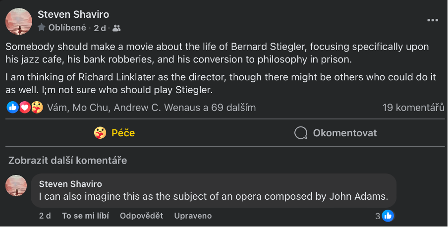 Obecně potřebujeme aktivní „mimetickou touhu“ místo „microcelebrity“ statusu. Ale přiznávám, že nevím, jak obě strany oddělit.