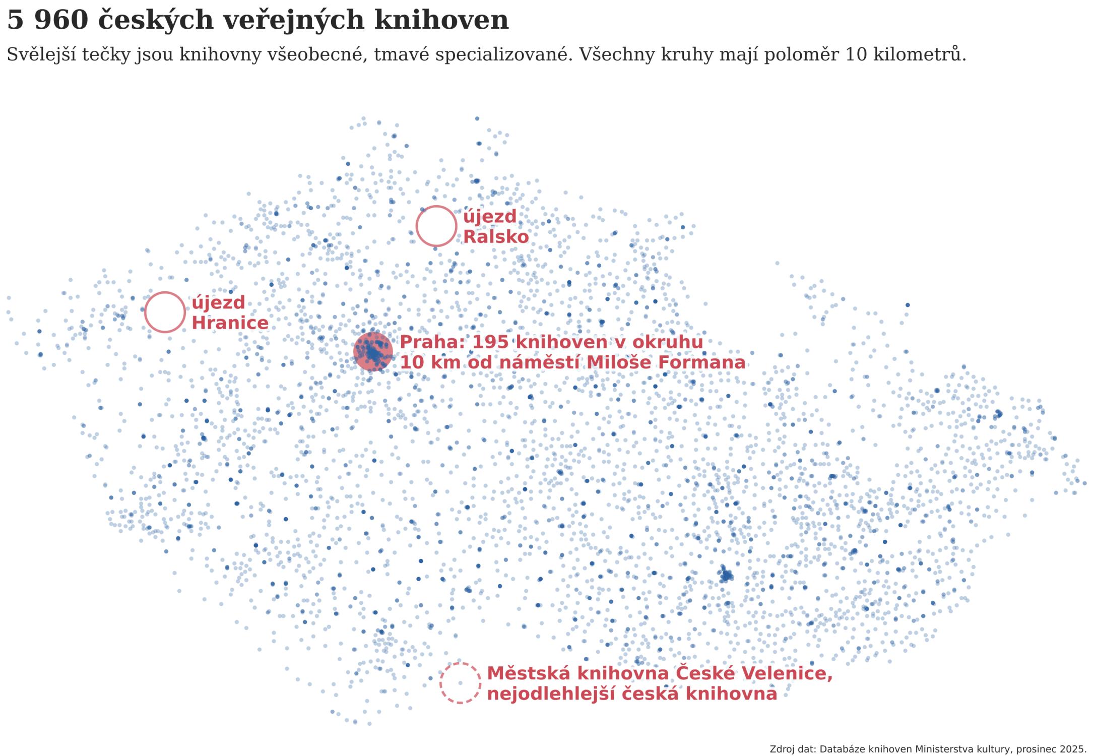 Že máme v Česku hustou síť knihoven, to se tak nějak ví. Teď však konečně můžeme vidět, jak moc hustá je. Přinášíme ochutnávku datových sloupků, které do Hosta tento rok píše novinář Michal Kašpárek.