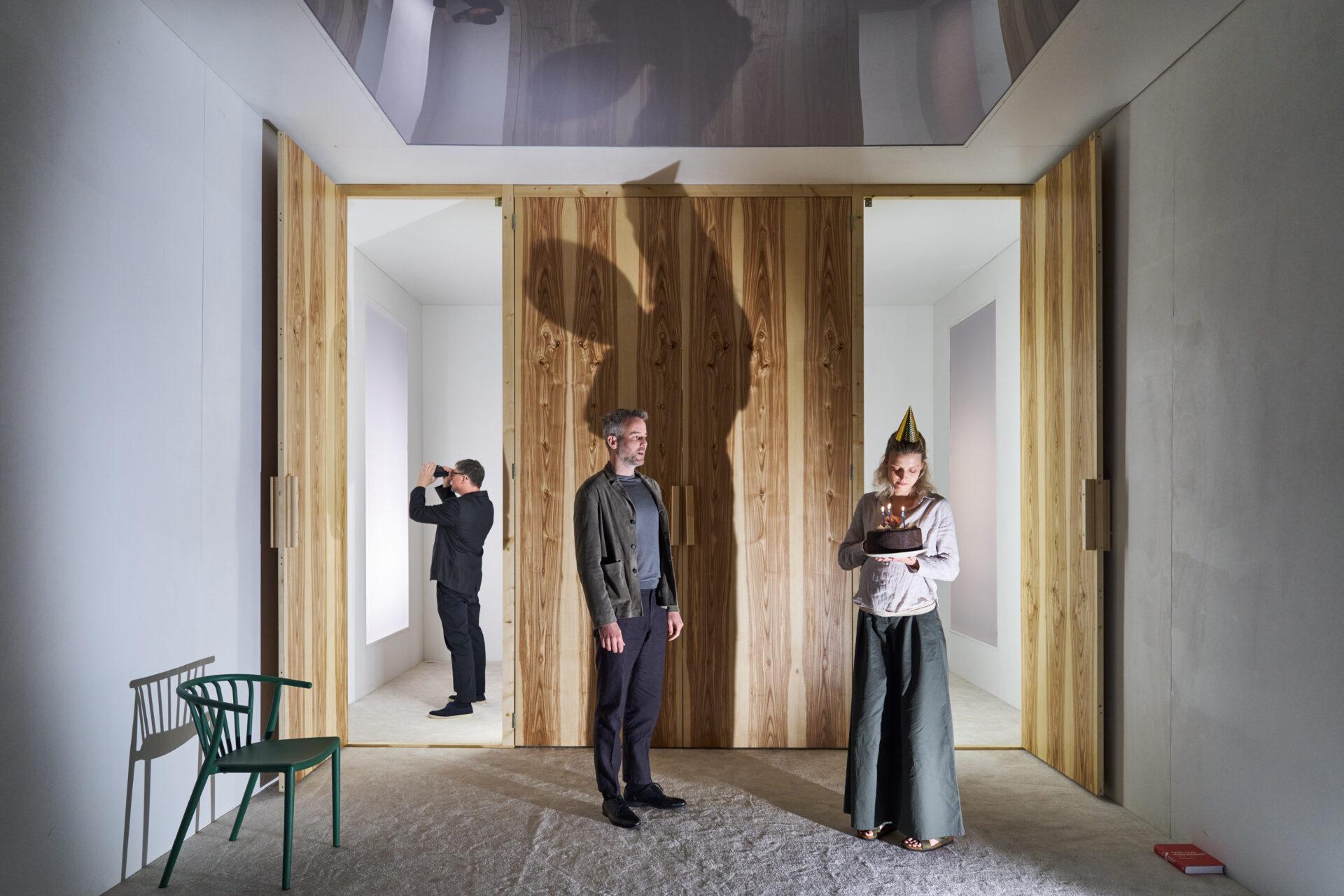 Protagonista často působí ve společenských interakcích toporně, někdy dokonce komicky. Zvlášť symptomatická je scéna z dětské oslavy, na níž Linda spontánně navrhne, aby se Karl Ove nechal jedním z jejích přátel vyfotografovat. Miloslav König se pitvoří do pomyslného objektivu, předvádí nemístná gesta a posunky, v jednom okamžiku dokonce to, jak močí. Z pozice diváka se lze jen těžko ubránit smíchu, přestože nelze danou scénu brát doslova, neboť její podstata je mnohem méně humorná. Jde o výrazový prostředek, který nemá ilustrovat sociální neobratnost Karla Oveho, nýbrž jeho vnitřní prožívání situace. Karl Ove se před objektivem, ale i na oslavě jako takové cítí příliš exponován, pozornost okolí je pro něj nesnesitelná, jako by ho desítky očí pozorovaly při mnohem intimnějších činnostech. Dojem tísnivosti posiluje vědomí, že se na Karla Oveho neupíná pozornost pouze jeho přátel coby dalších postav hry, ale i celého divadelního sálu.